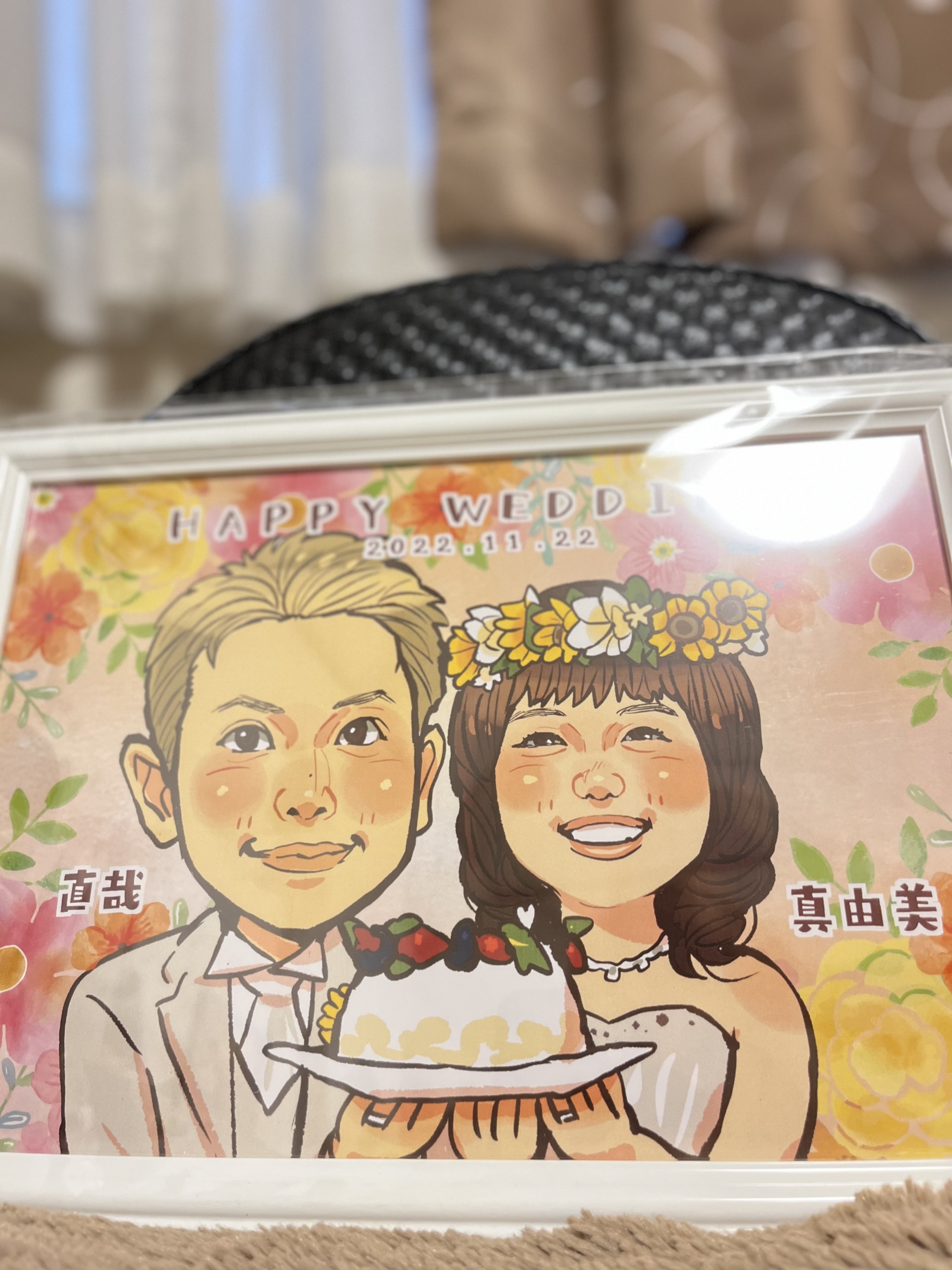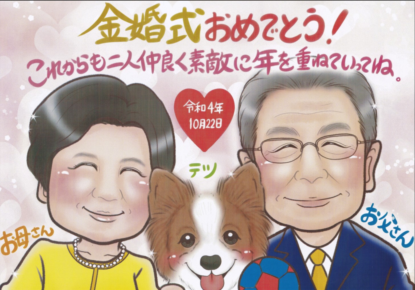 上月先生に『2人最上級の幸せそうな顔に描いて下さい』とお願いしたところ『心を込めて描かせて頂きます。』とのメールを頂きました。1週間足らずで作品が届きました。まず開封した私の目に両親の満面の笑みが飛び込んできて涙が止まりませんでした。早速母に届けたところ作品を観てその場に泣き崩れました。「お父ちゃんが笑ってる…お父ちゃんが笑ってる…」と繰り返しながら。「これでずっとお父ちゃんと一緒に居れる…」とも。たった数枚送らせてもらった写真でここまでリアルにそして温かい作品を本当にありがとうございました。母に最高のプレゼントが出来ました。