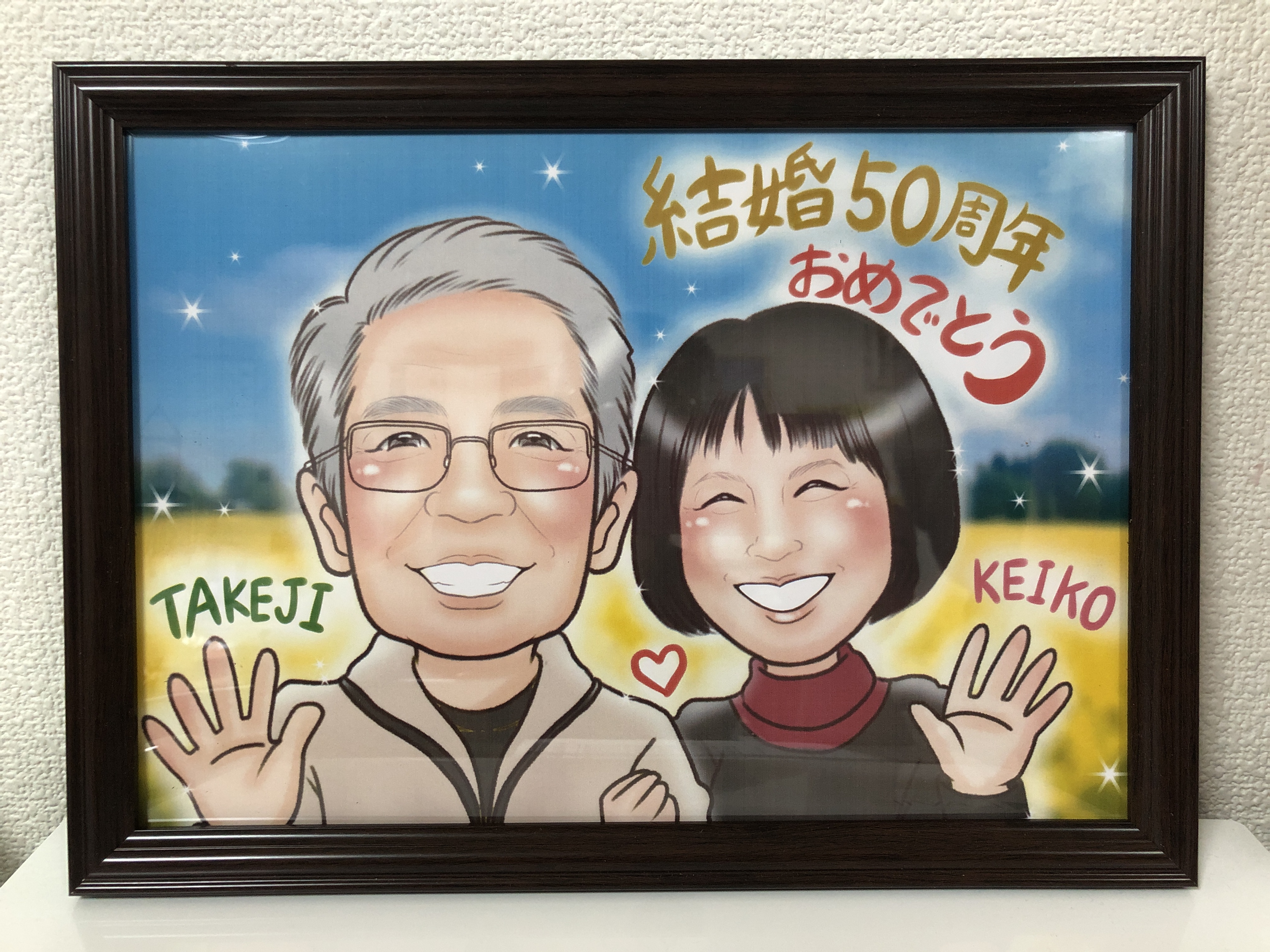 義理父母の金婚式のプレゼントに似顔絵をプレゼントします。当日サプライズで花束と書いていただいた似顔絵を渡す予定です。到着が間に合うかドキドキしましたが、この絵が届き箱を開けて思わず笑みがこぼれました。本当に似顔絵っていいですね また途中色々とご丁寧にご対応いただきありがとうございました。今度は私達の銀婚式の似顔絵をお願いしたいです。