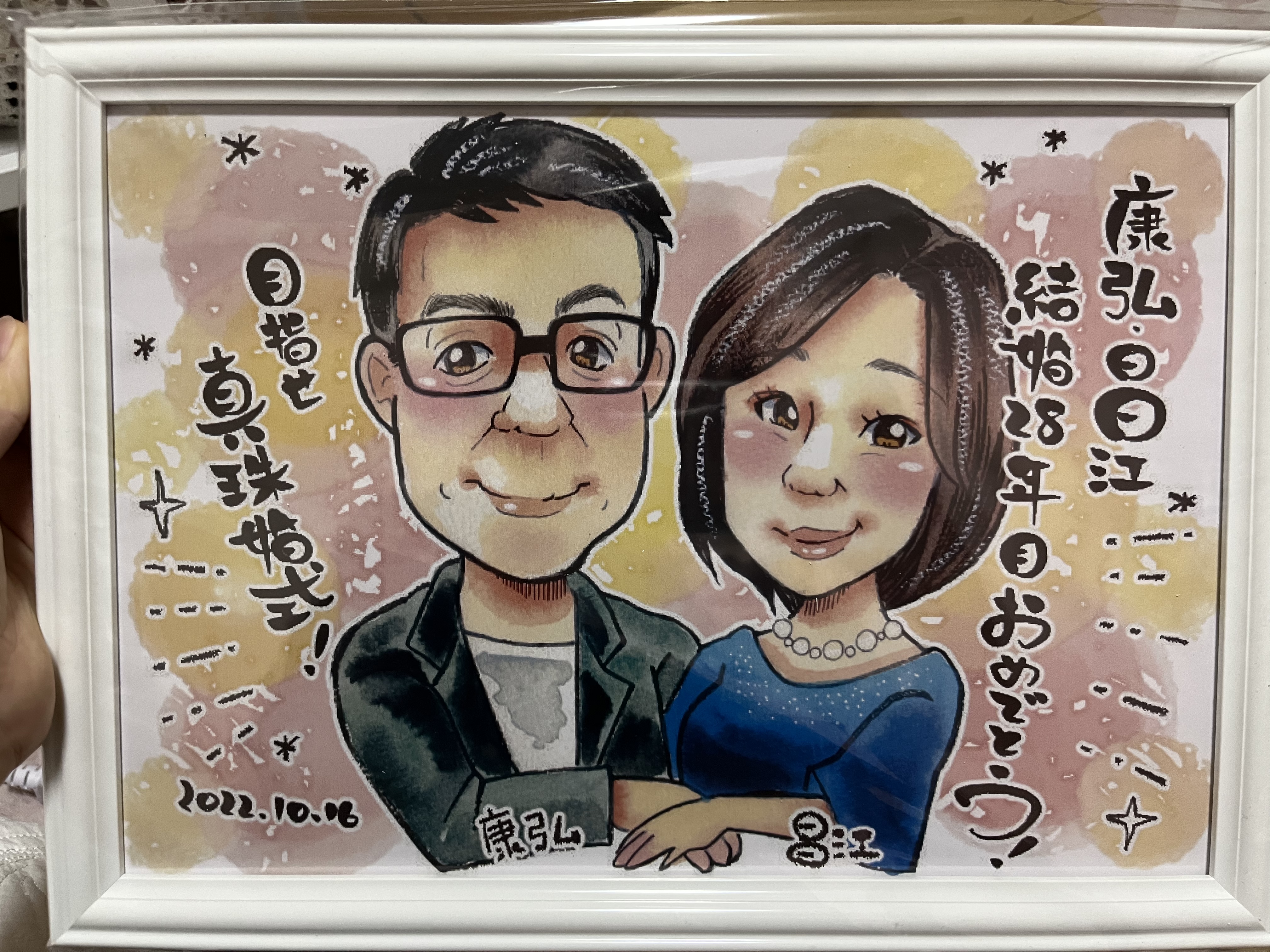 両親の結婚記念日のプレゼントにと思い注文させていただきました。 初めての注文だったので正直心配なところもありましたが、とても満足です! 両親がとても喜んでくれました! 額縁もセットになっているのでそのまま飾れました! 笑っちゃうくらいそっくりな絵にみんなで驚き、笑顔になりました! 家族のとても良い思い出の日になりました! 素敵な絵をありがとうございました!