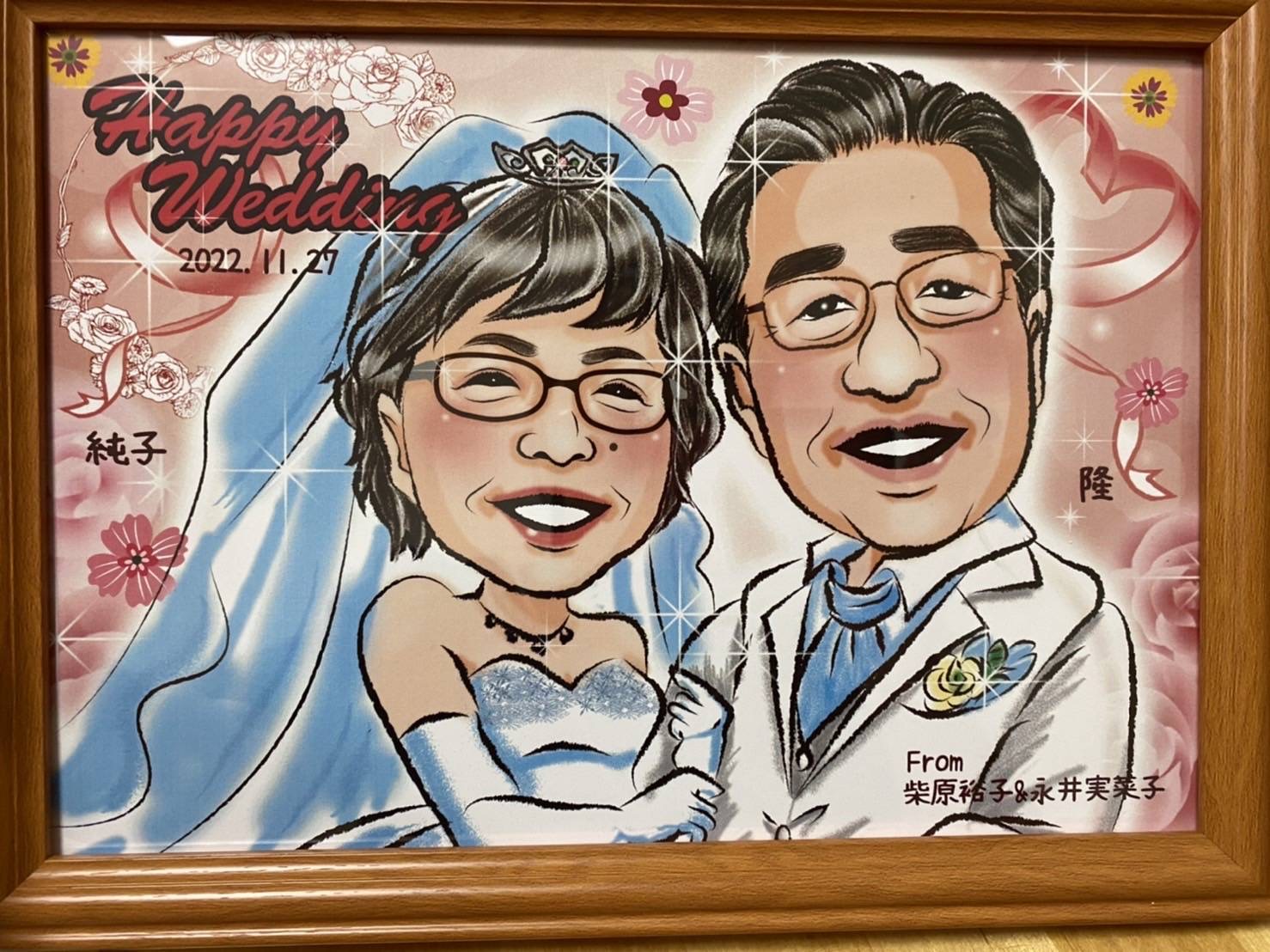 とても雰囲気のよい似顔絵に仕上がってました。父も母も似ててびっくりしました。いつも、お世話になってる両親にこころ温まるプレゼントになりました。来週、金婚式のパーティーで似顔絵を披露してプレゼントする予定です。必ず気に入ってもらえると思ってます。ほんとにありがとうございました。また、機会があれば利用させて頂こうと思います。ありがとうございました。