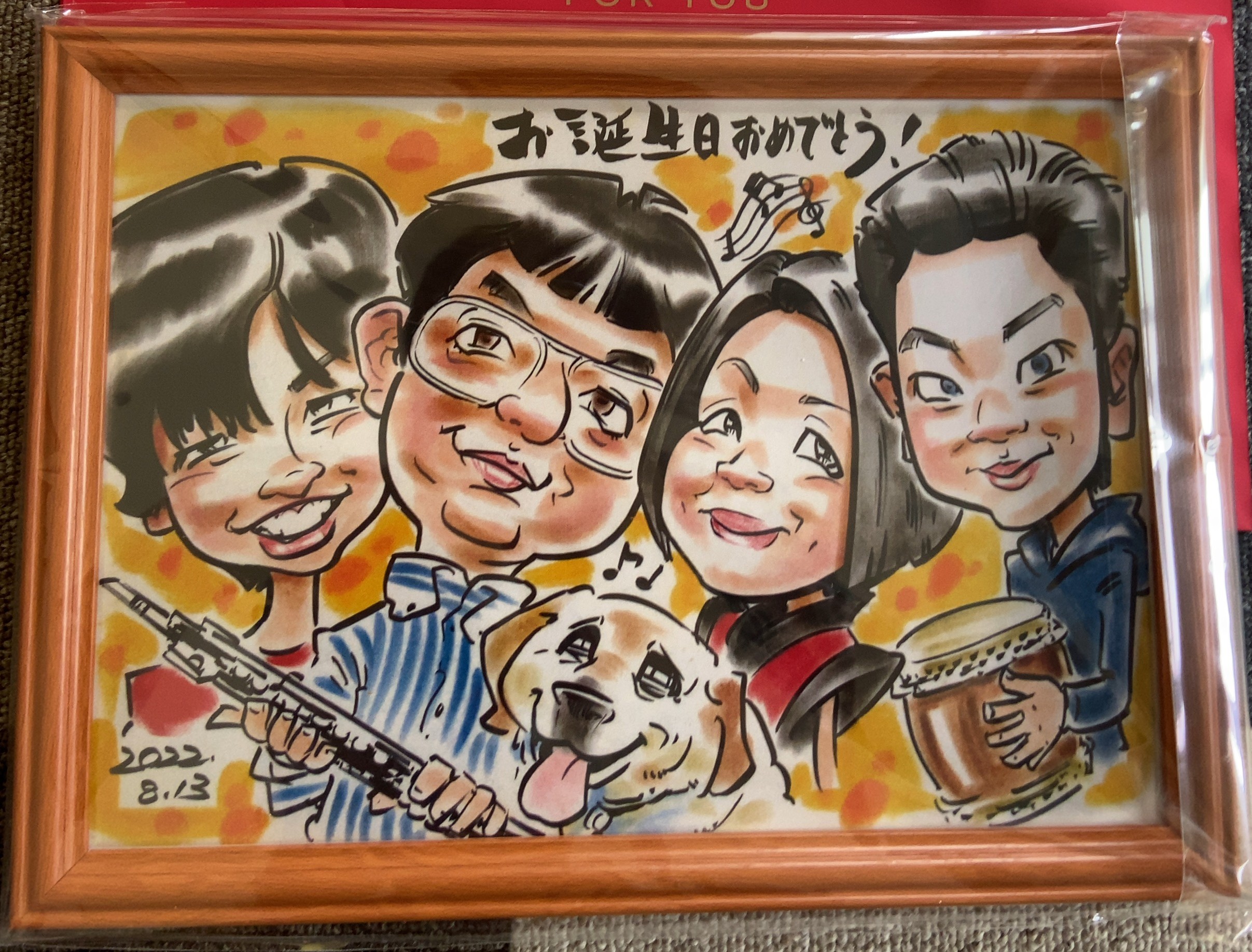 絵師の体調不良のため、急遽の変更となりましたが、短期間にも関わらず丁寧に人物、ペット、楽器の特徴等を捉えて描いていただき、とても満足しています。 誕生日プレゼントとしての発注のため、受け取った本人は画像データのやり取り等は知らず、袋から商品を出しての「なにこれ!?すご〜い!」の第一声が嬉しかったです。 機会があれば、また利用させていただきたいと思いました。 ありがとうございました。