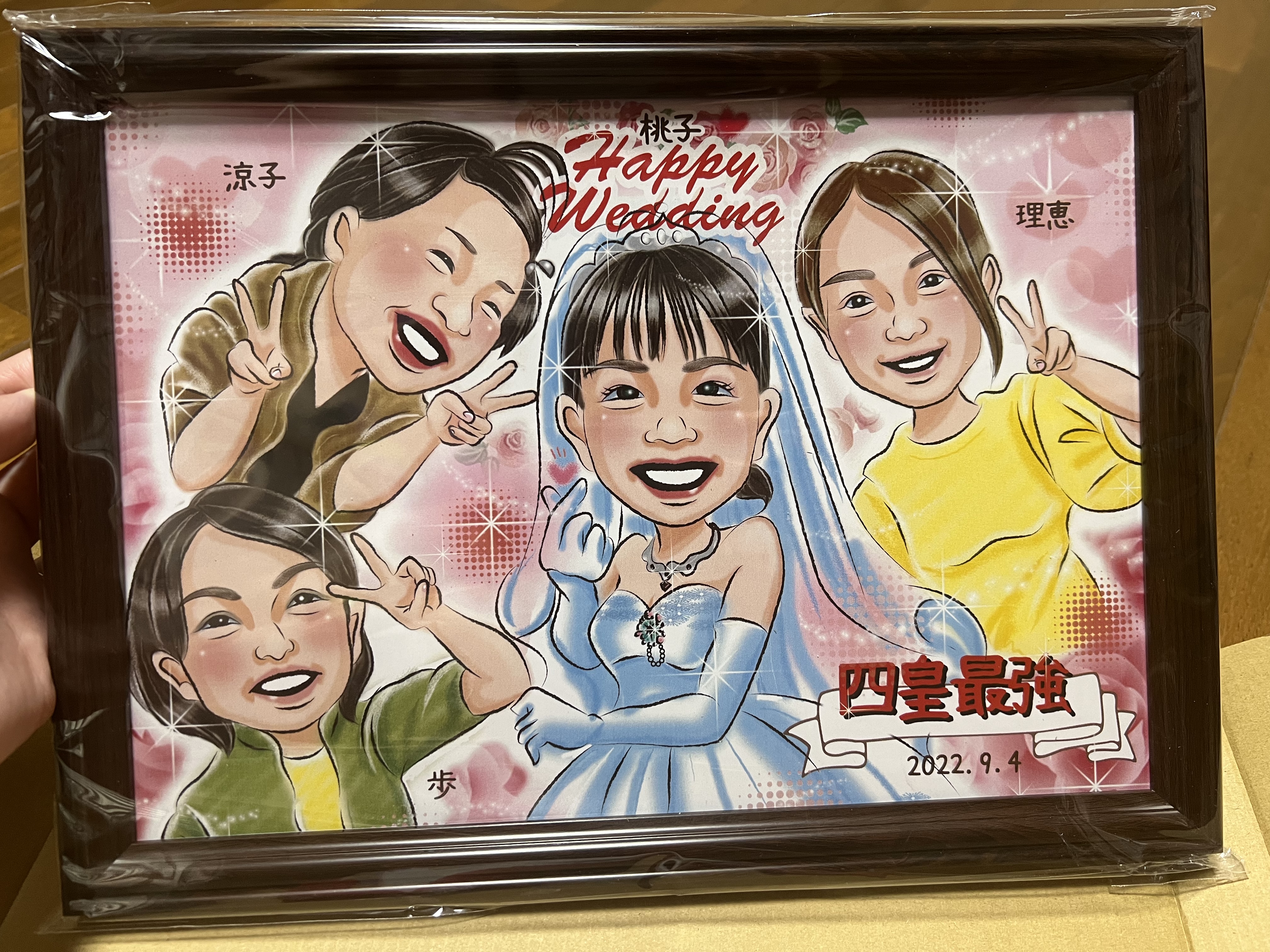 無事に到着しました。 初めての似顔絵注文。 他のお店では1ヶ月程かかるのに、制作日数も早くて大丈夫かな?と心配しながらも誕生日に間に合わないので注文。 注文の時に大体の情報は入力したけど素人がうっかり入力し忘れた情報の確認もLINEでしてくれてその上細かい注文も受けていただいて誠実な対応に安心しました。 その上出来上がった絵はみんな似てる❗ イメージ通りの仕上がりに満足です。 またこちらにお願いしようと思います。 ありがとうございました。