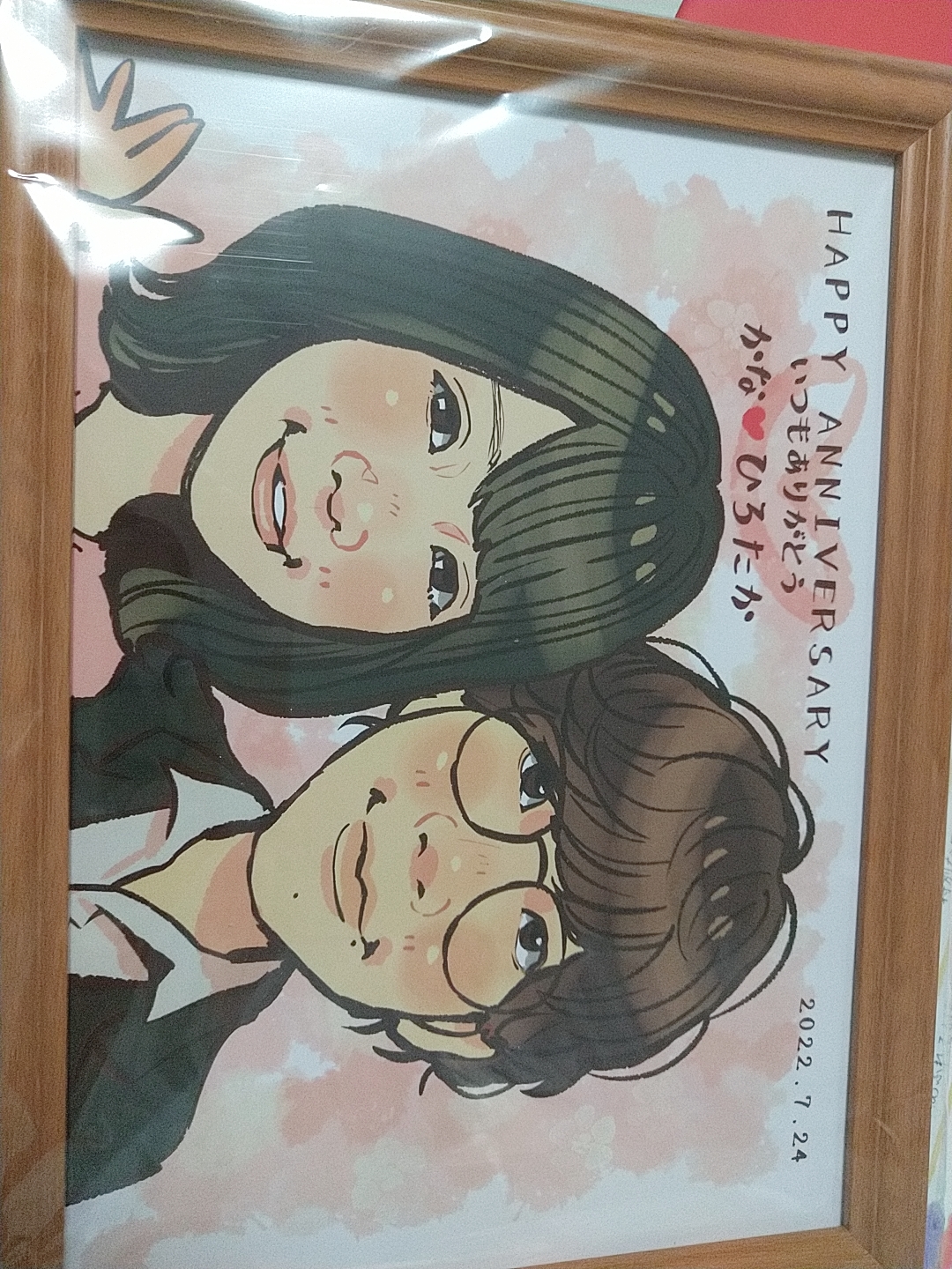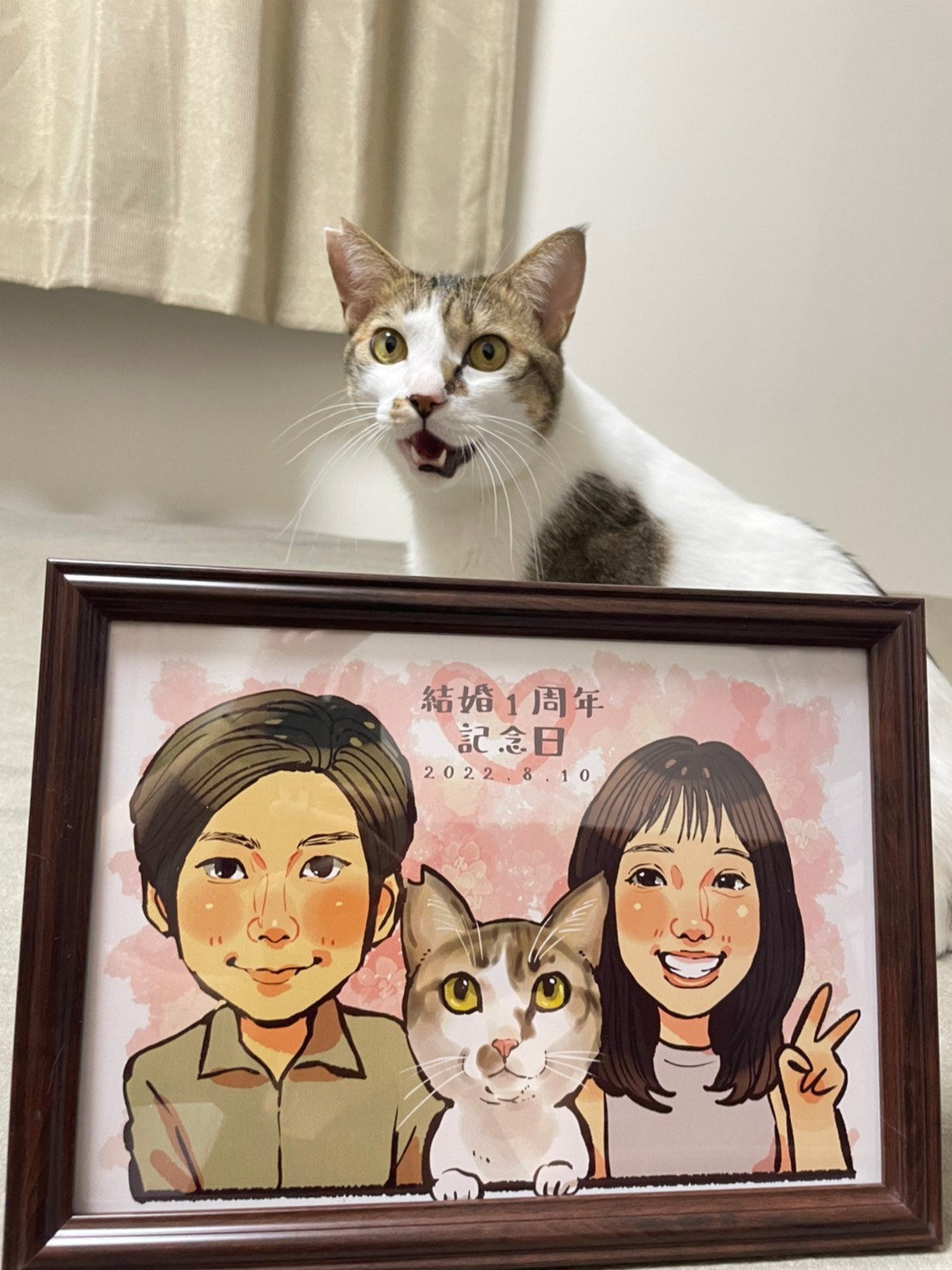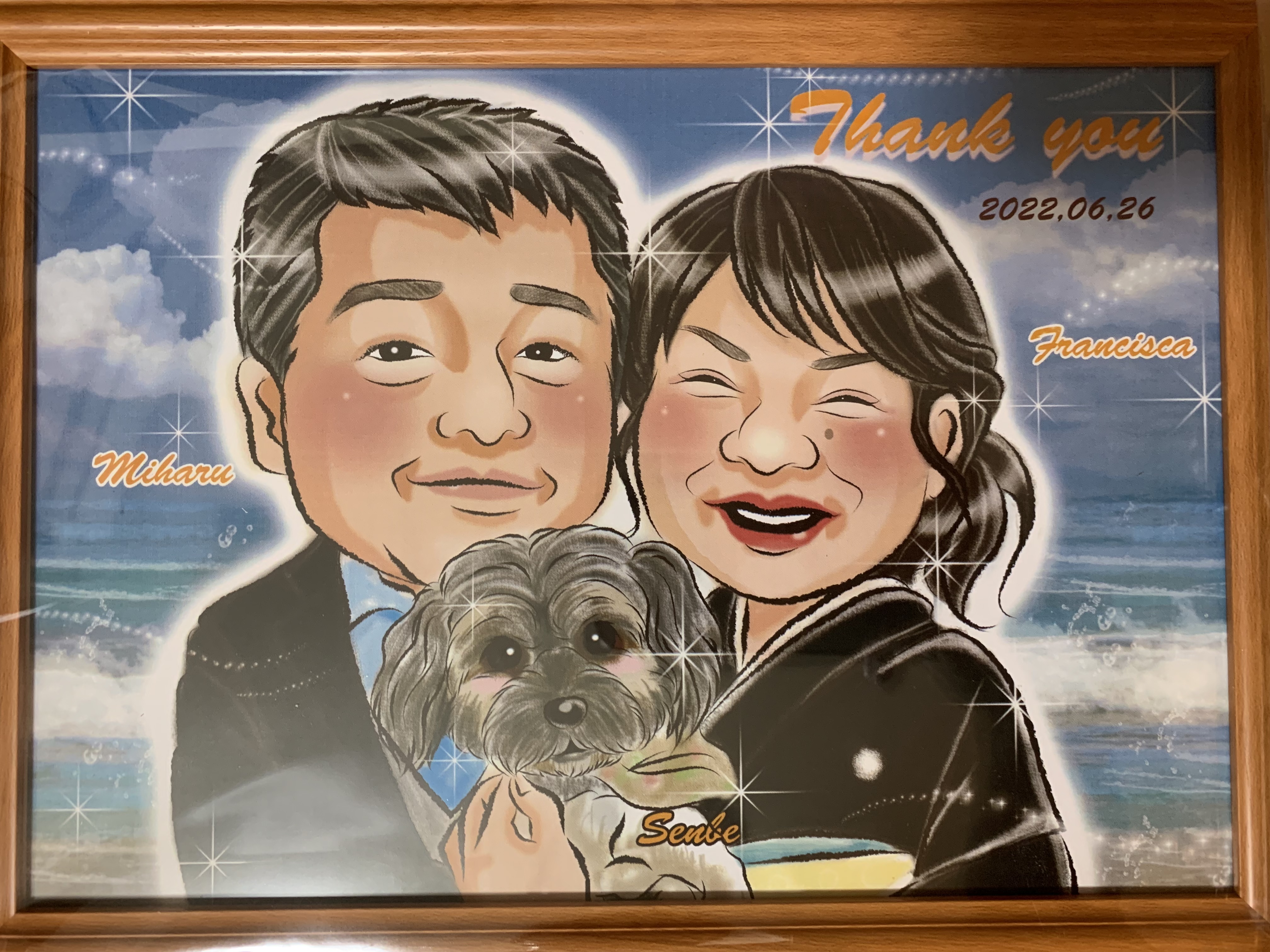 6月の自分の結婚式で、自身の両親への贈呈品として依頼いたしました。自身の父親が17年前に亡くなっており、一人で育ててくれた母親に感謝の気持ちでサプライズしたく今回注文に至りました。父親の生前の写真と特徴が分かる写真、今生きてたら60代でこんな感じで〜等、割と細かい注文してしまいました。初めは違う絵師さんにお願いしようとしたところ、日程が間に合わないと連絡が。正直日程もギリギリであったがどうしても結婚式に間に合わせたい気持ちがあり、日程間に合う絵師さんの中で、サンプルのワンちゃんの絵に惚れ、飼い犬も描いてもらいたかったので、今回mewmewさん指名しました。