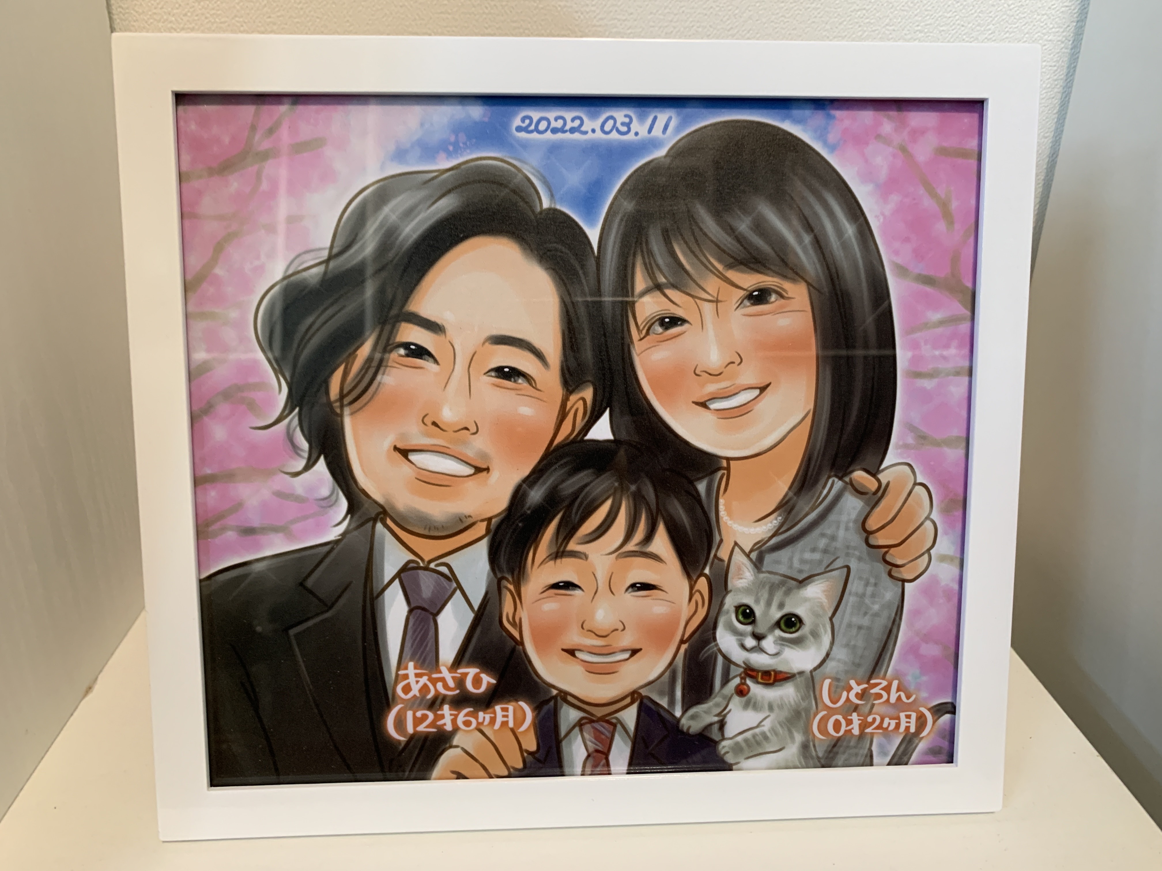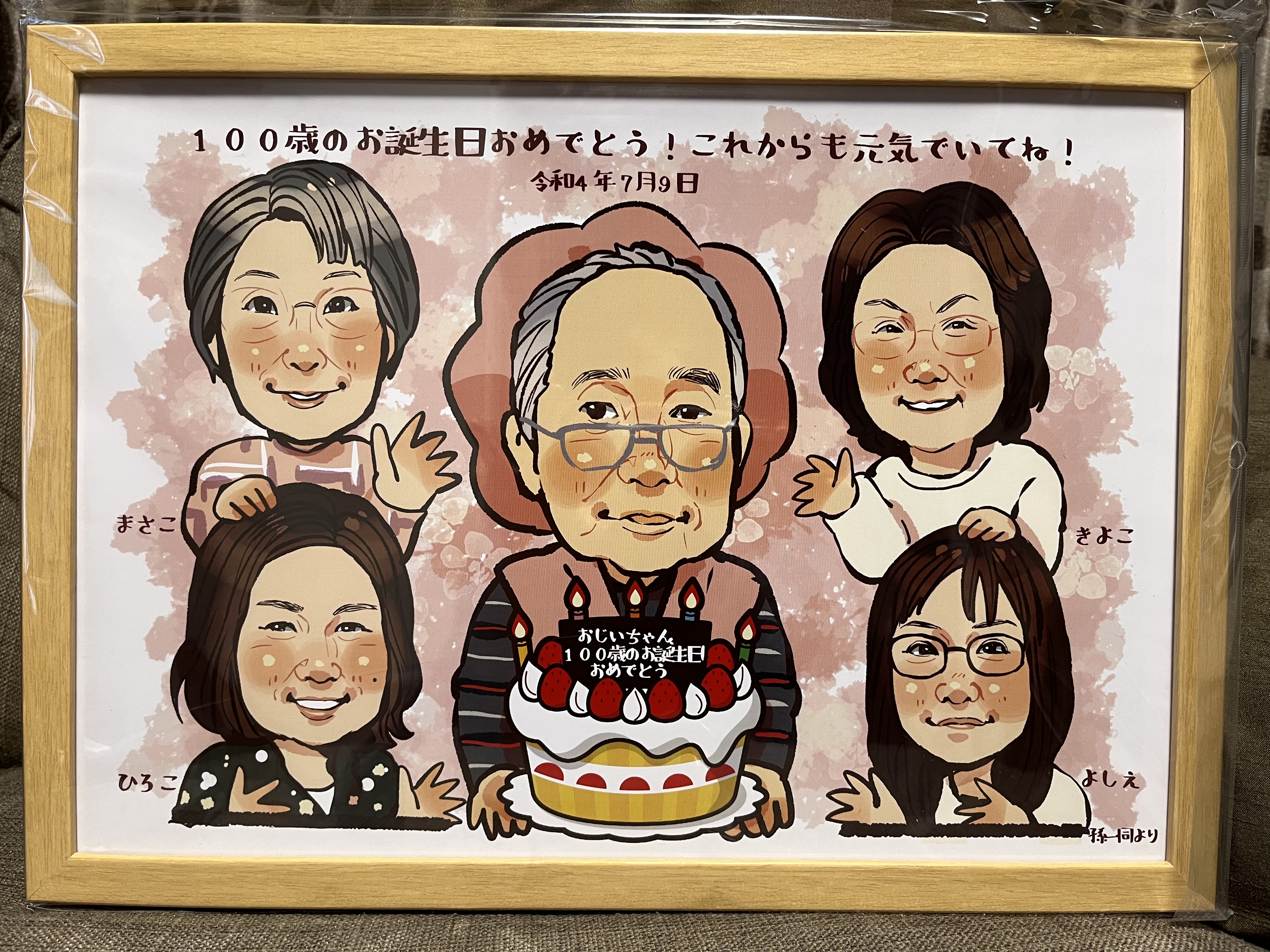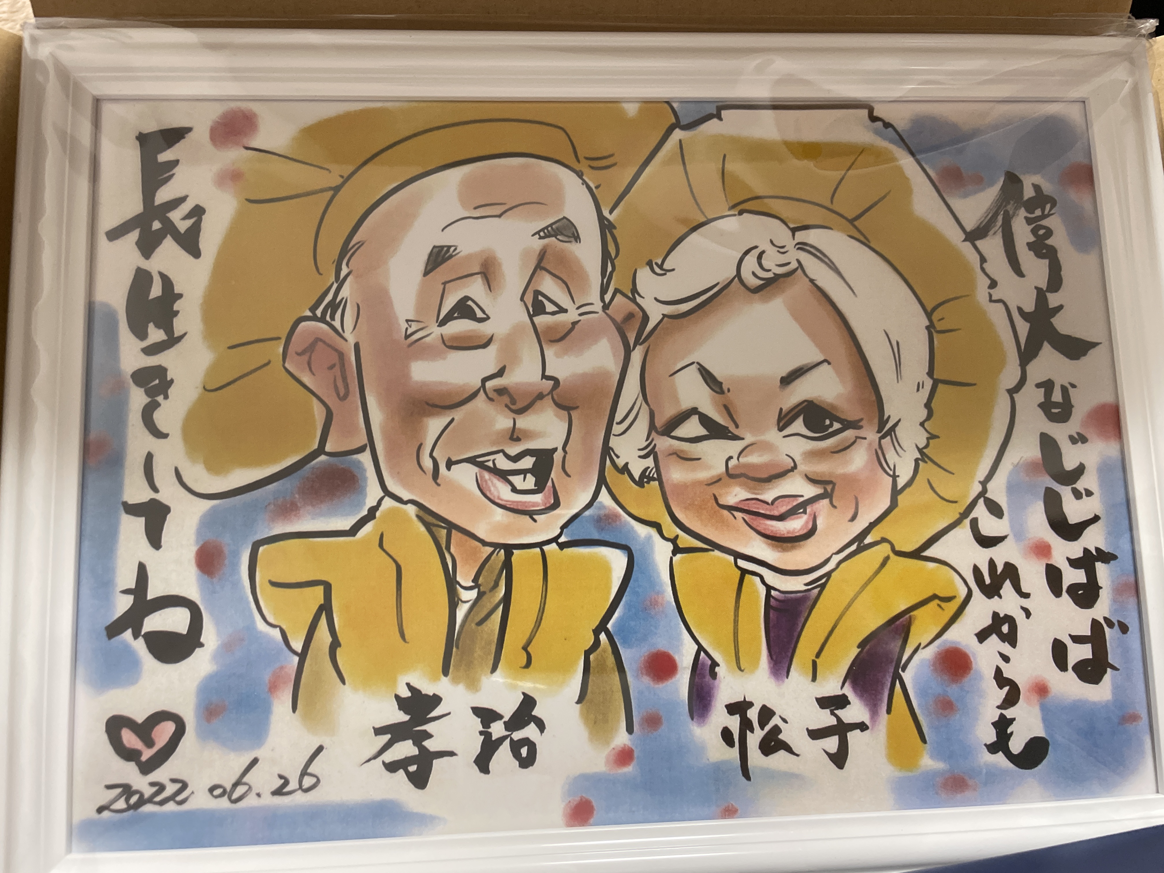 今回、コロナ禍の影響で約8年ぶりに親戚一同が集まるという事もあり、サプライズで子供・孫からのプレゼントとして発注させて頂きました。2家族分注文させて頂きましたが、とても鮮明な似顔絵で写真の特徴をしっかり捉えたクオリティーの高い似顔絵が手元に届きました。現代のカメラ・携帯カメラは鮮明な写りで顔の表情を映し出してくれますが、似顔絵の場合、蛍光色を使用することで写真には無い、色彩の表現を全面に映し出してくれるのでとても綺麗な作品だと感じました。お盆休みに渡すまで時間が待ち遠しいですが、似顔絵のフレーム(額縁)際に、子供・孫たちが写った写メを何枚か入れてみて、さらに似顔絵に花を咲かせてみようかと思います。ありがとうございました。