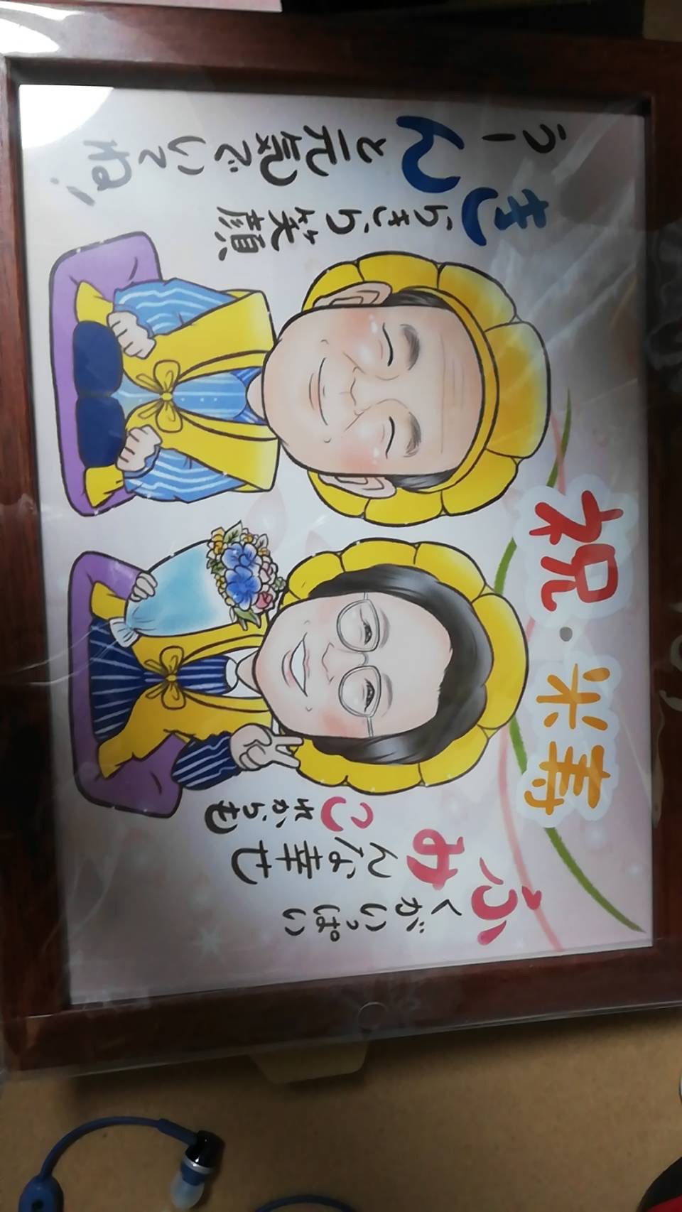 大変可愛らしい絵で満足致しました! 祖父が少し似ていない気がしたところはありますが、祖母は似ておりました。 注文どおり、名前の文字を強調してくださったところや、やわらかい雰囲気にして、背景に花柄を描いてくださりありがとうございます。 黄色のちゃんちゃんこもとても可愛らしいです。 またお願いするときは、どうぞよろしくお願い致します。