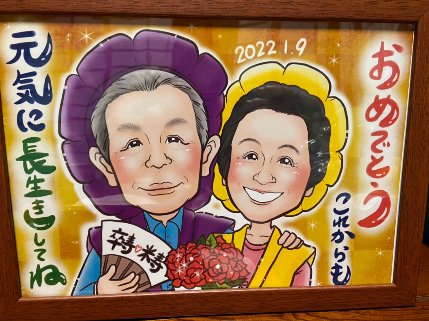 送った写真から顔の特徴をよく捉えて、満足のいく素敵な似顔絵でした。両親の長寿祝いを何にしようか考えていたのですが、インターネットで長寿祝いを検索したところ、似顔絵グラフィックスさんの似顔絵が目にとまり注文させて頂きました。きっと両親も喜んでくれるのではと思います。また機会が有れば、利用したいと思います。ありがとうございました。