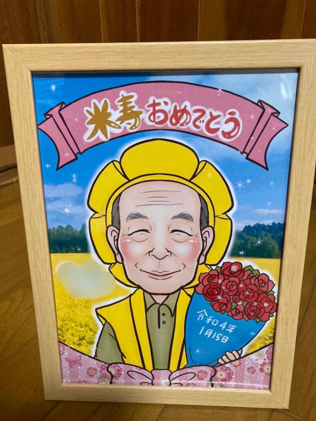 本当に早い発送でした!!日曜注文、金曜には手元に、土曜の米寿祝い当日に手渡すことができました!!暖かいタッチで描かれており、とても可愛らしかったです!祖父も喜んでおりました! 初めてイラストのプレゼントをしましたが、渡す方も貰う方も心がほんわりするので、イラストプレゼントいいものですね!これから活用しようと思いました!!