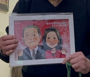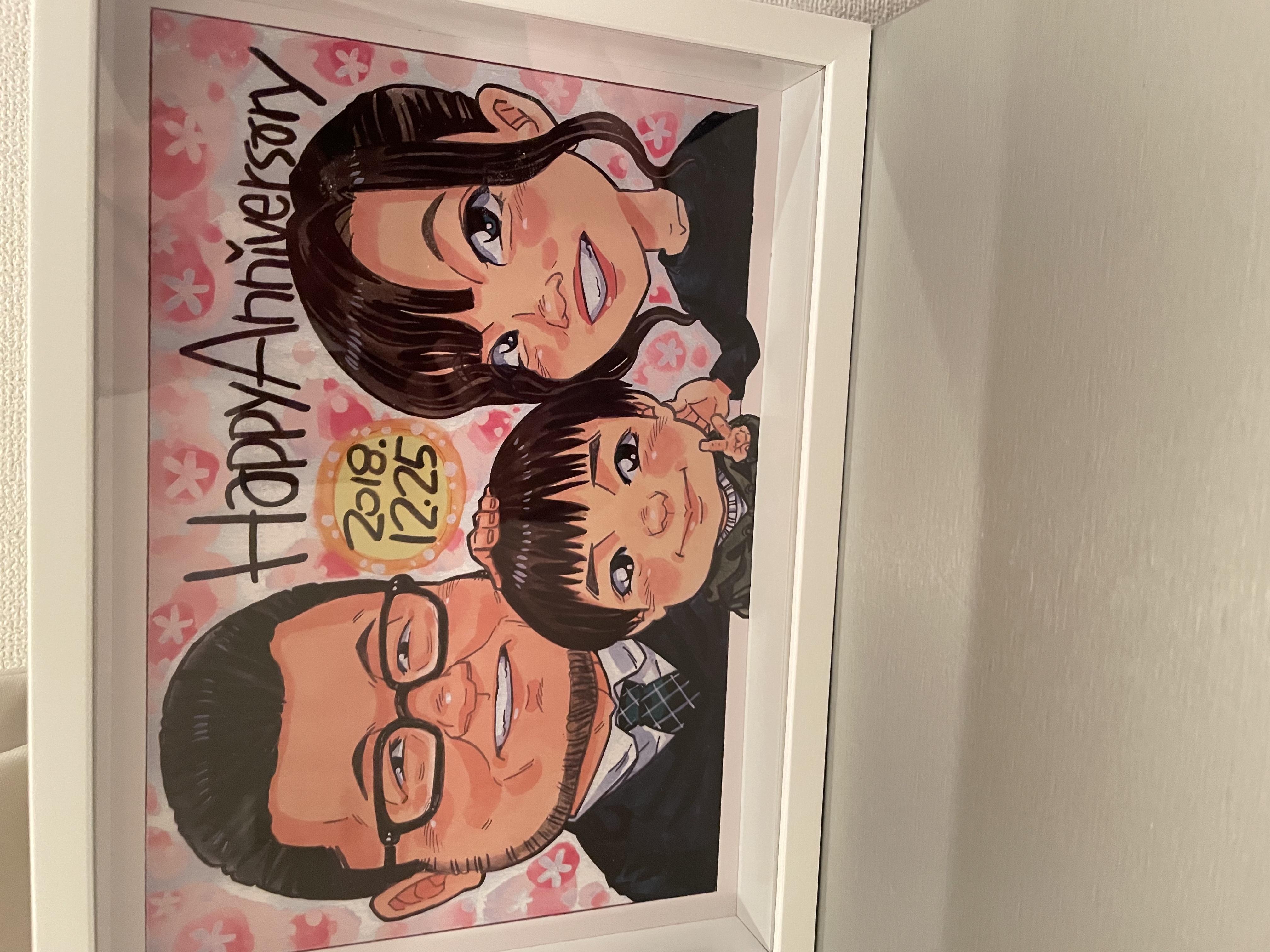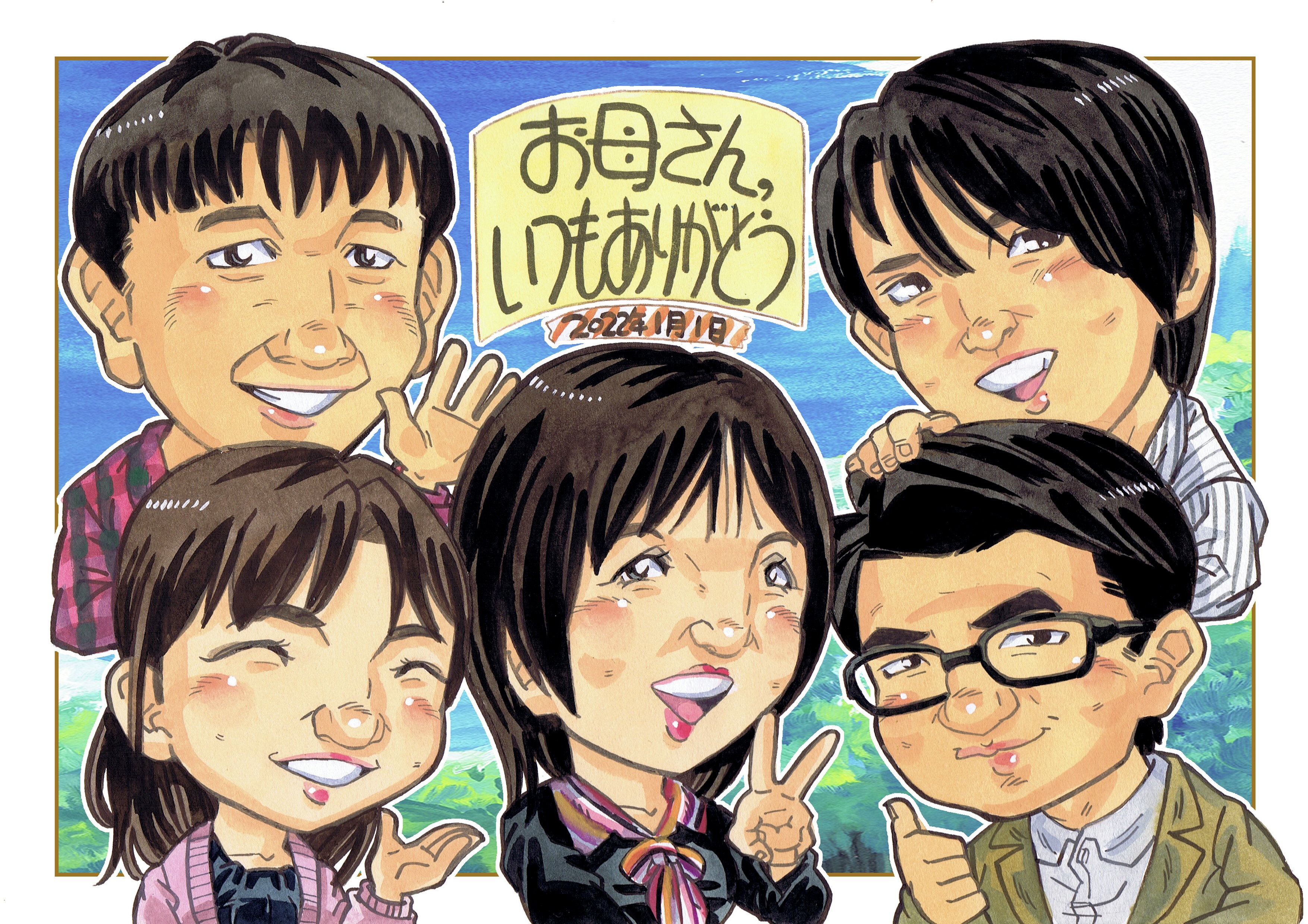 お世話になりました。 似顔絵、受け取り、確認いたしました。 明るい元気な絵となっており、妻に渡す時の反応が、楽しみです。 実は、これから渡すのですが、 家族皆に似顔絵のことは秘密にしているので、 渡す時の家族皆のリアクションが楽しみです! また、機会がありましたら、よろしくお願いいたします。
