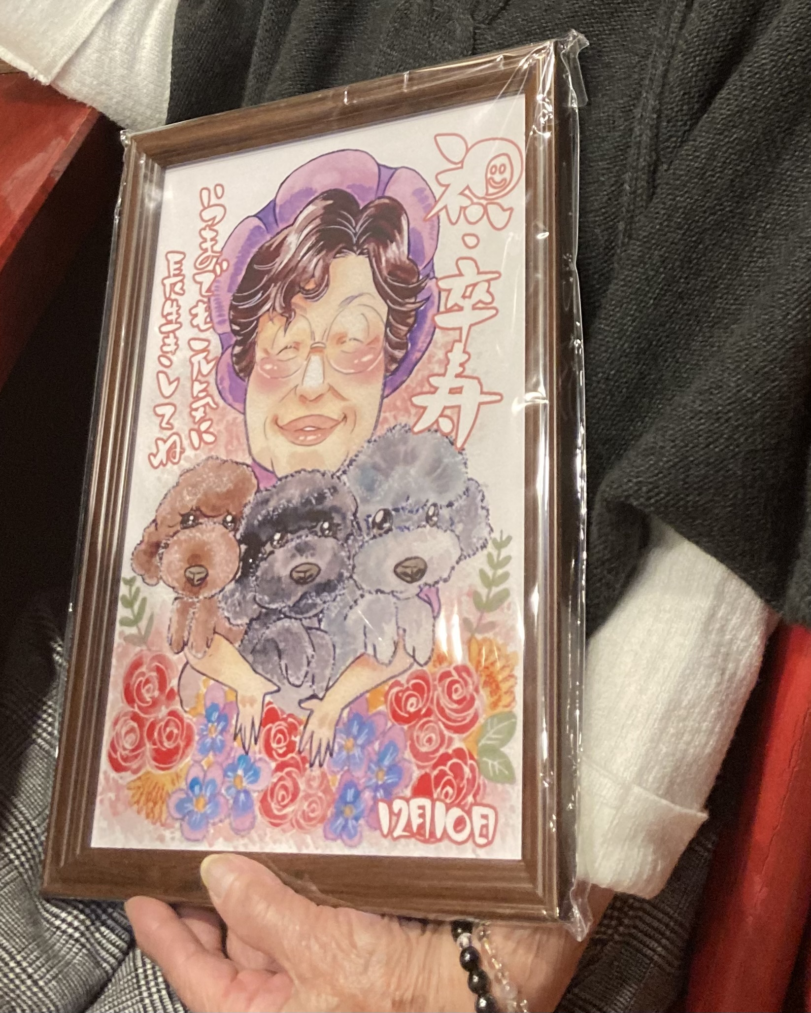 第一希望の絵師さんは予約でいっぱいだったので、別の方に変更しましたが、すごくそっくりに書いてくれて、祖母も喜んでくれました。注文から納期も早く、渡したい日に間に合ってよかったです。オリジナルのイラストはあげた側にも、もらった側にも思い出に残るベストプレゼントだと思います。また記念日に利用するかと思いますのでよろしくお願いします。