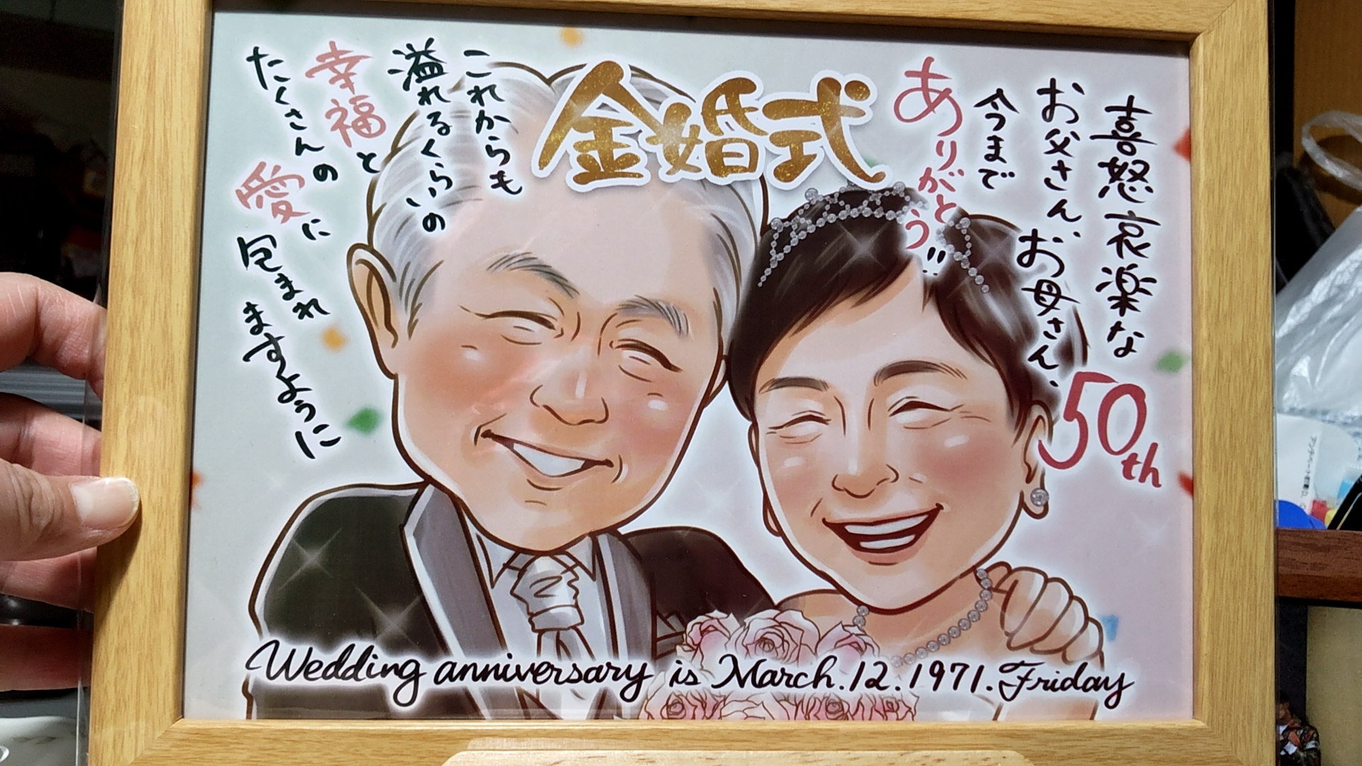 初めて利用させて頂きました。両親の結婚50周年の記念として描いて頂きました。素敵な仕上がりで、とても喜んで頂けました。本人たちよりも、若く可愛くて描いて頂き、それがよかったみたいです(笑)また、短い日程だったのですが、間に合わせて頂き助かりました。また機会があれば、利用させて頂きたいです。ありがとうございました。