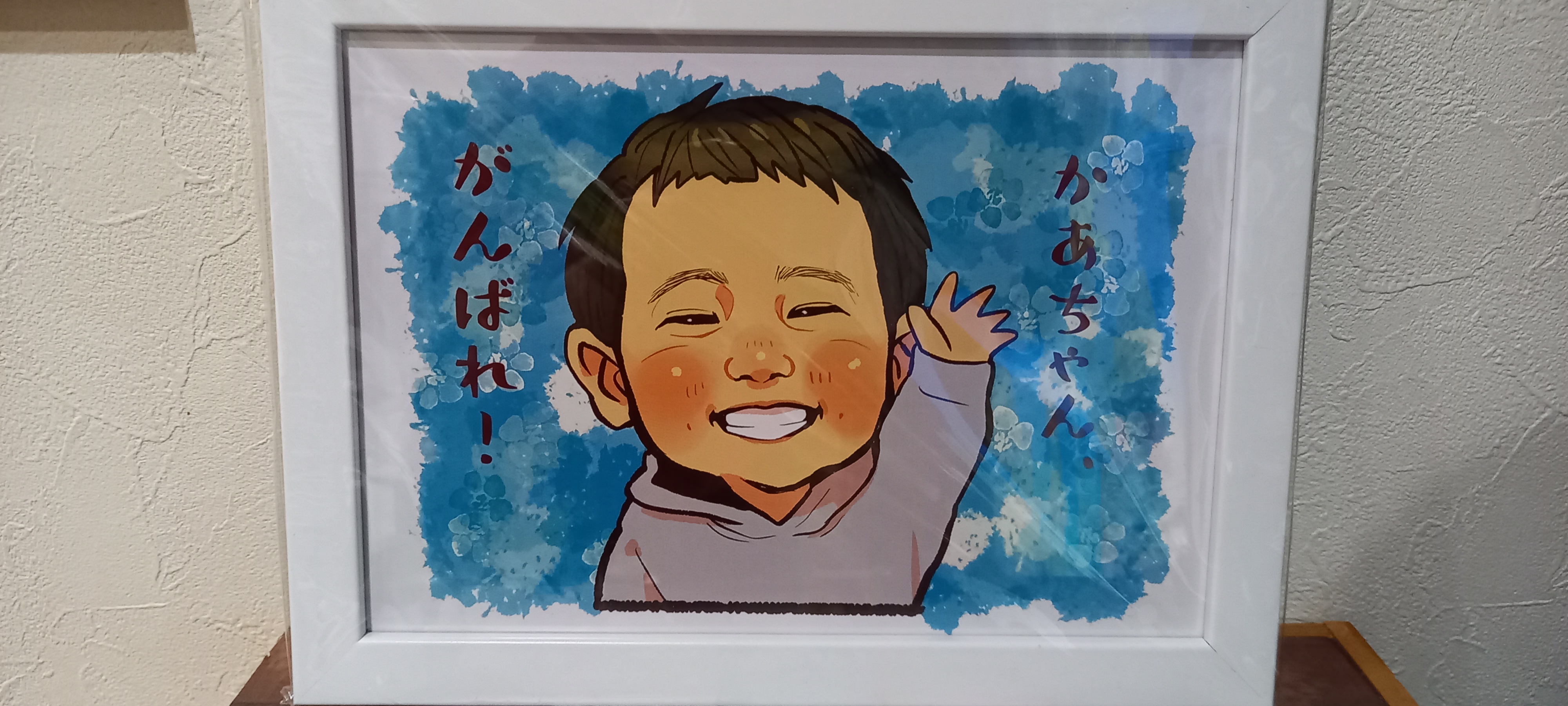 妻が入院することになり、コロナ禍でお見舞いにもいけないということで、サプライズで息子の似顔絵を贈ろうと思い、お願いしました。妻に秘密での注文、配送等々いろいろ面倒かけたと思いますが、親切に対応していただき、感謝しています。妻も病室で初めて息子の似顔絵を見て、泣いて喜んだようです。利用して本当によかったです、ありがとうございました。