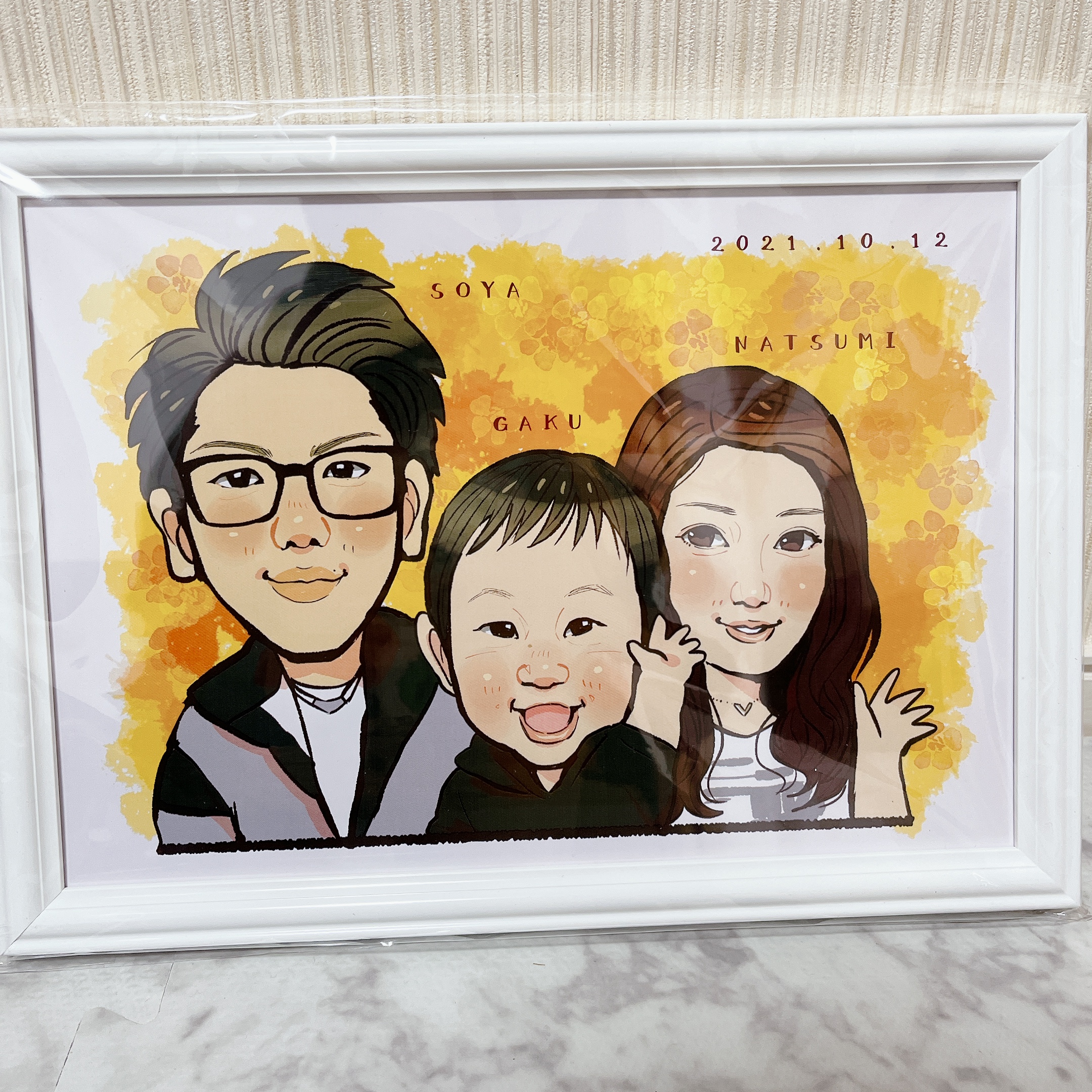 素敵な似顔絵ありがとう この度は、似顔絵の発送いただき大変ありがとうございました。 先ほど無事に受け取りました。 私を含め家族も皆とても楽しみにしていたので、家に届くまではワクワク 丁寧に梱包された中身を開けるのにドキドキ 開けた時には可愛らしい似顔絵が見えて、わぁ♪っと皆の顔が笑顔になりました。 その後は皆、和気あいあいと似顔絵を見ながら、とても幸せな時間を過ごせました。