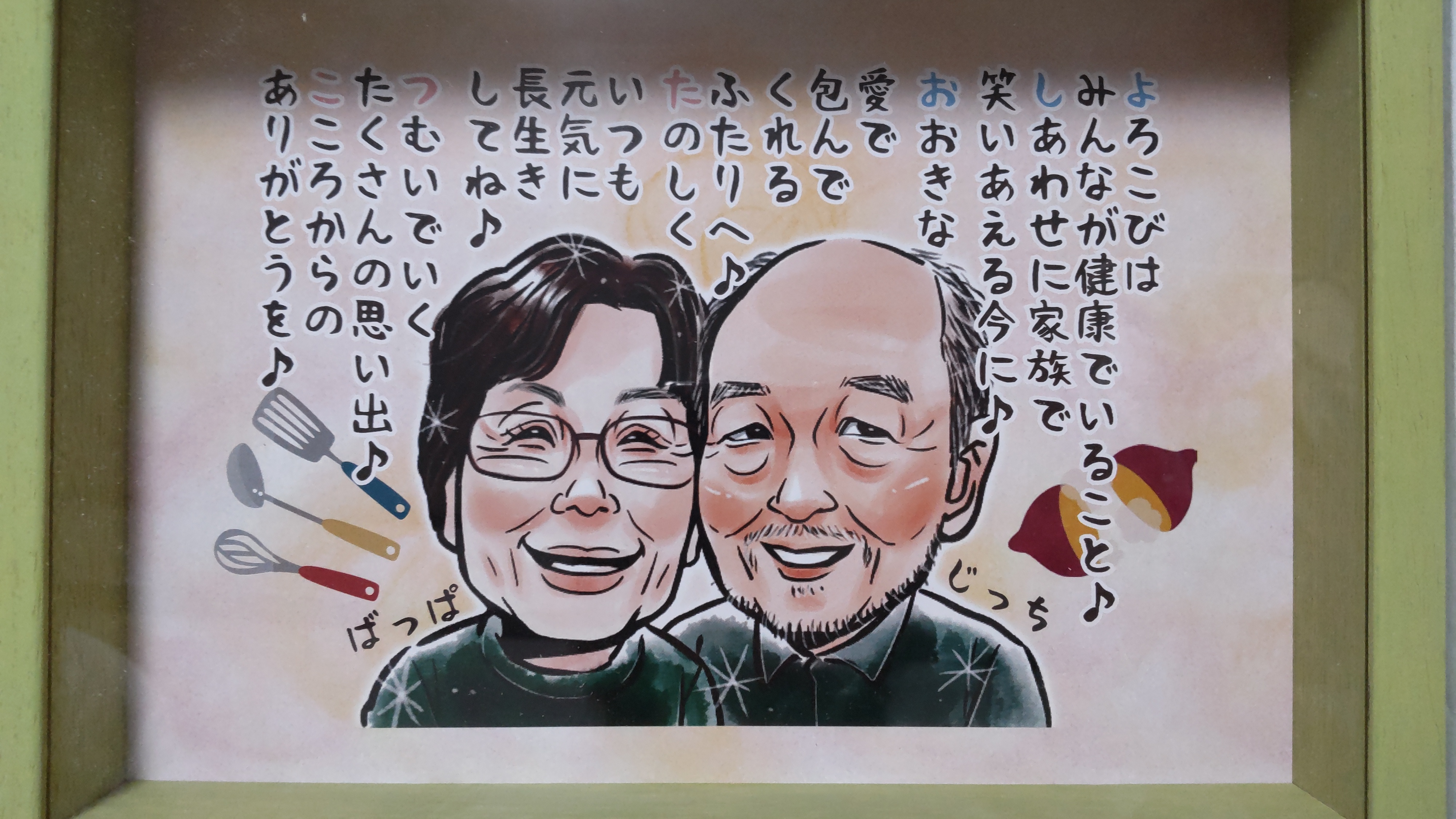 予想していたよりとても良い似顔絵で親への感謝を伝えられると思いました。 私たちの結婚式後のサプライズで渡しました。 旦那の両親はとても喜んでました。 途中で絵師の変更等もありましたが頼んで良かったです 本当にありがとうございましたm(_ _)m また、頼むこともあるかもしれまんのでその時は、お願いしますm(*_ _)m