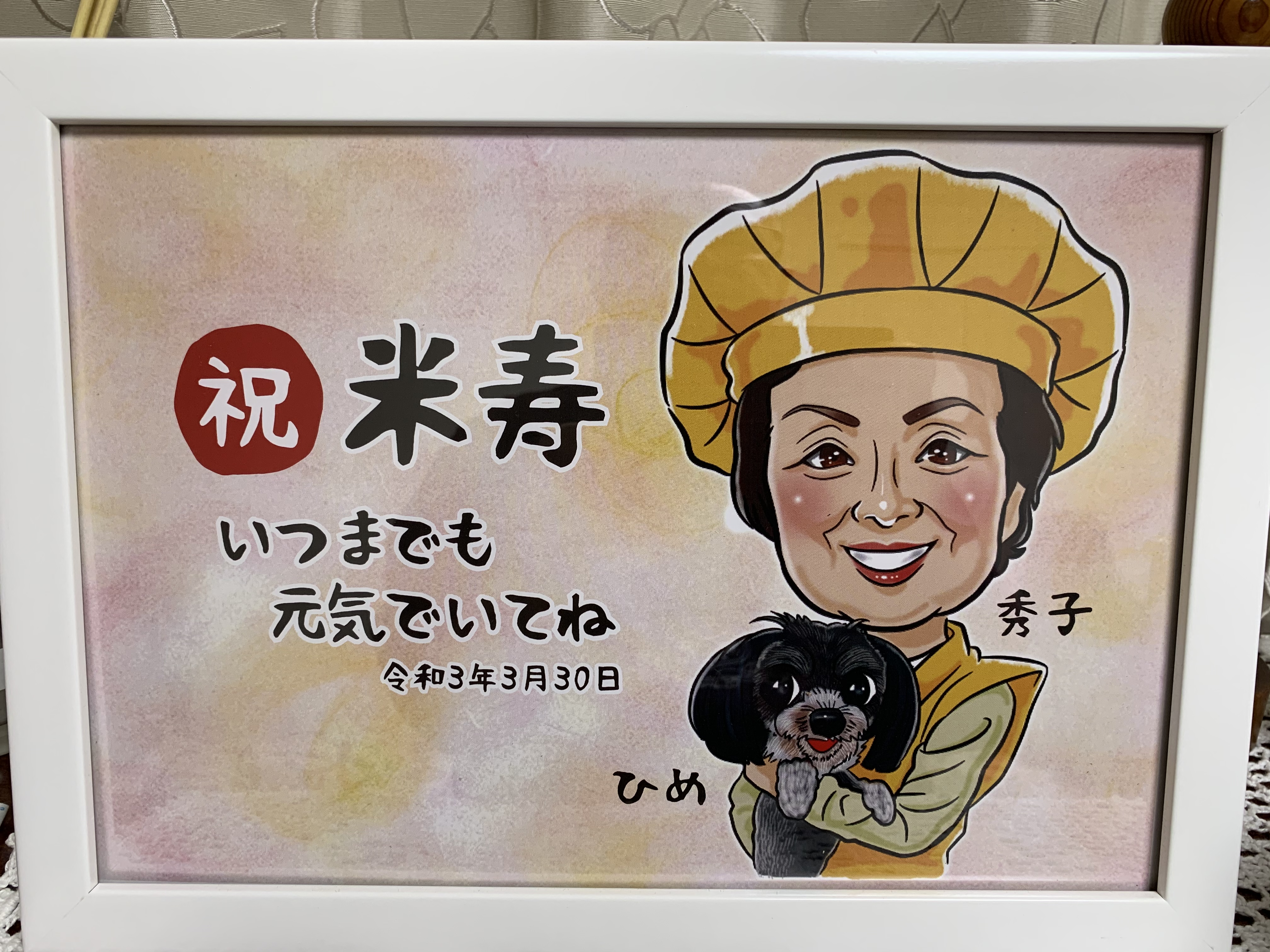 米寿祝いで ちゃんちゃんこ姿や花束を手に持って とか いろいろ注文させてもらいましたが、思ってた以上に可愛く 本人よりべっぴんさんに仕上げていただき(笑) 本人も大変喜んでくれて 良い記念品になりました。 前回は 義父の米寿祝いにと どんなプレゼントがいいか悩んだ末 似顔絵は… と思い浮かび 利用させてもらい 家族も高評価でしたので 今回の義母のプレゼントは 絶対に と思っていました。 ありがとうございました